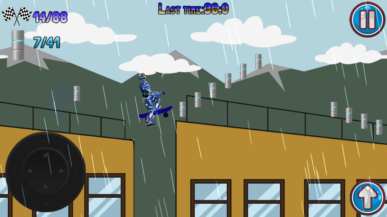 Sie haben das Rennen auf gerollten Läufen auf einem Skateboard satt? Müde von der Monotonie? Waren Sie dort, hat das getan, irgendwelche Maßnahmen vom Reisen? Dann ist dieses Spiel besonders für Sie, junger Spieler! Kontrollieren Sie Ihren Roboter auf einem Skateboard, aber nicht auf normalen Straßen: Gehen Sie auf Dächer von Gebäuden! Helfen Sie dem Roboter, an das Ende zu kommen, ohne zu fallen und verschiedene Tricks auszuführen!